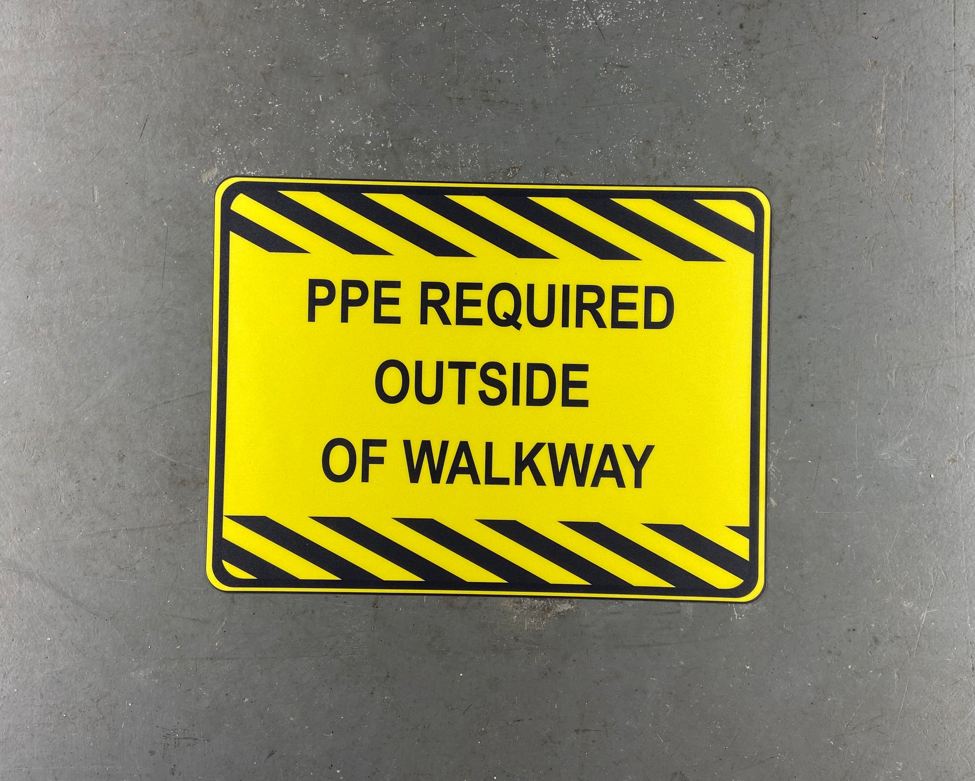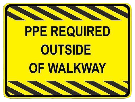 This floor sign notifies visitors and employees that PPE is required outside of the designated walkway.