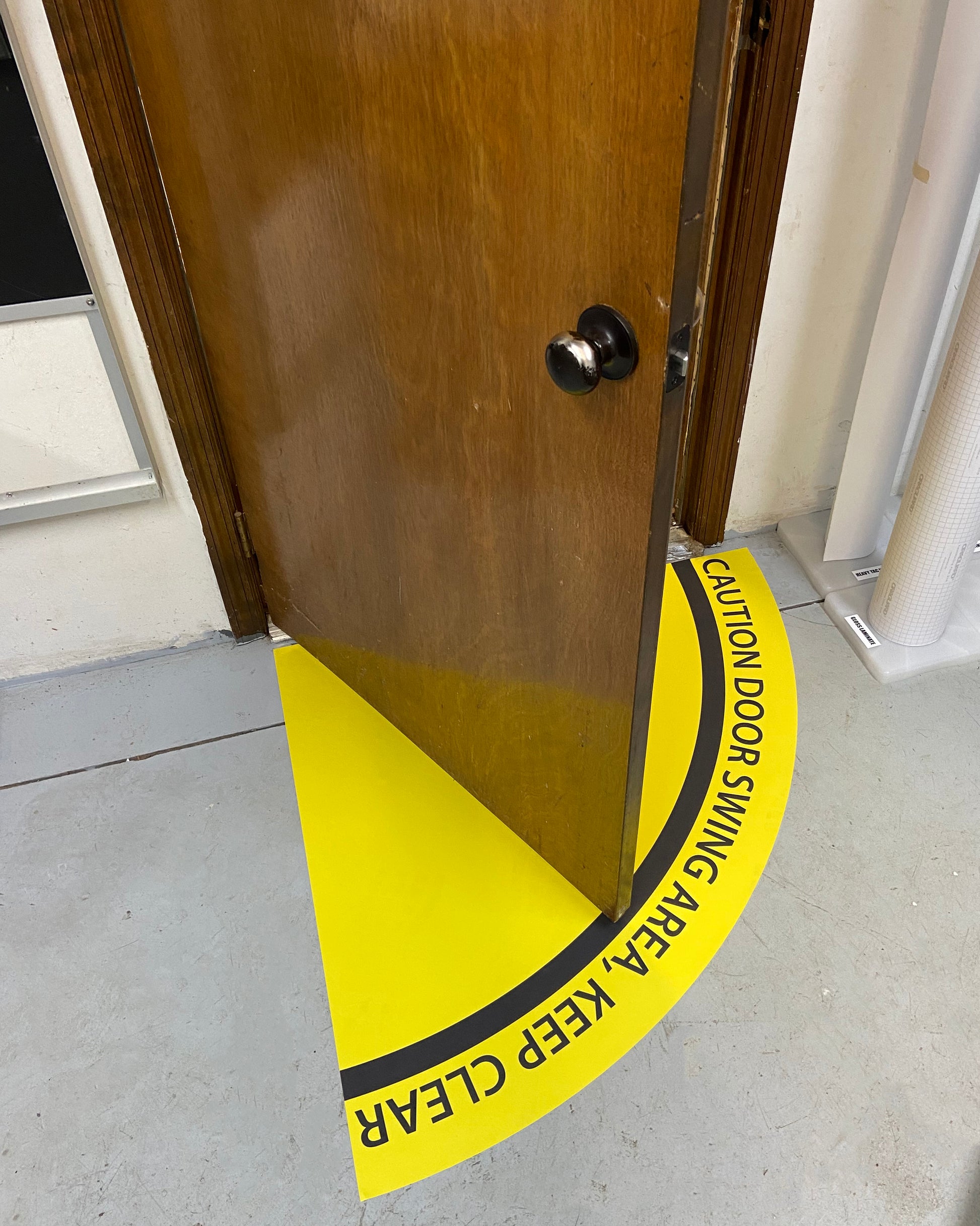 "Secure Medical Area, Maintain a 6 Foot Distance From Door" 1/2 Open Door Swing- Durable Matte Laminated Vinyl Floor Sign- Various Sizes Available